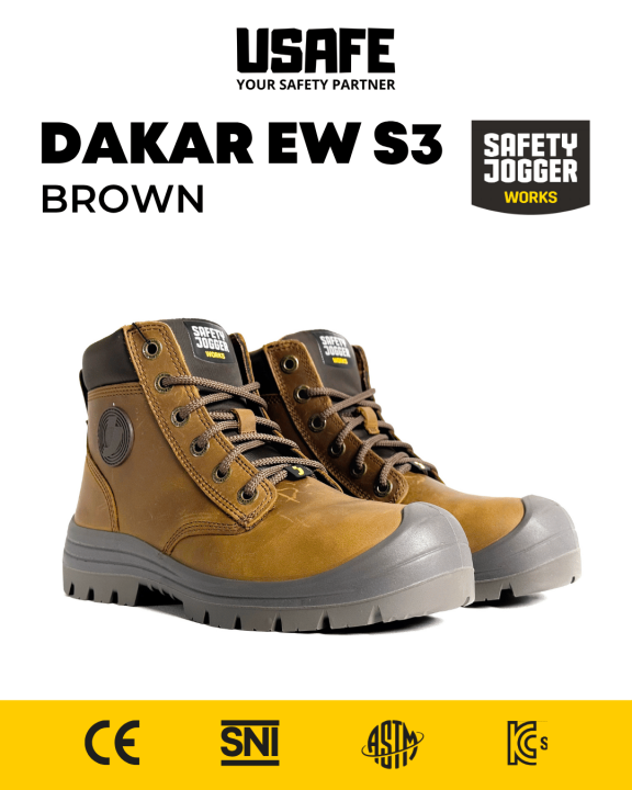2nd generation safety boot with a breathable leather upper and an extra wide toe cap. The DAKAR EW S3 from Safety Jogger is a leather safety shoe with an extra wide toe cap.